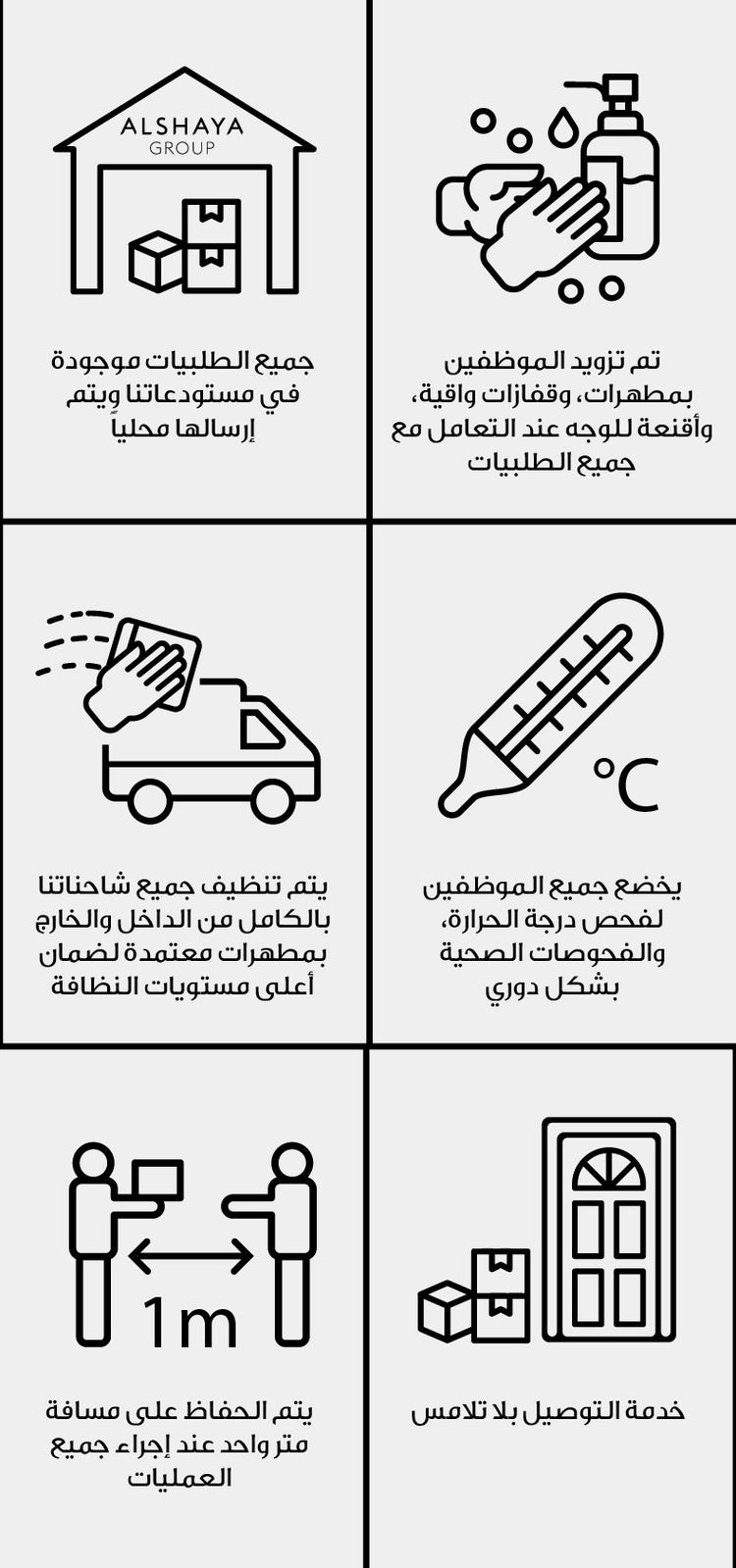 - نؤكد لكم التزامنا التام بإجراءات التعقيم والنظافة في جميع العمليات الخاصة بعملية الطلب والتوصيل من خلال سلسلة من التدابير الاحترازية التي تتضمن